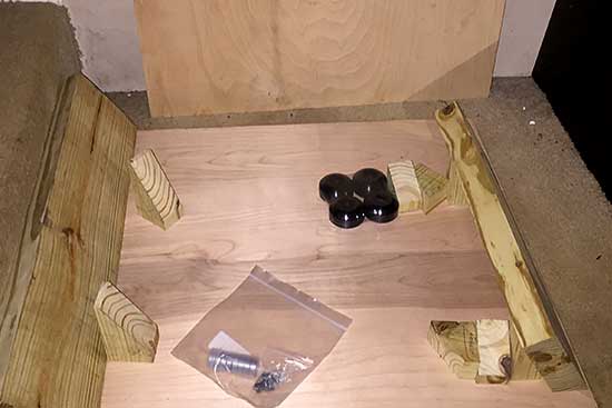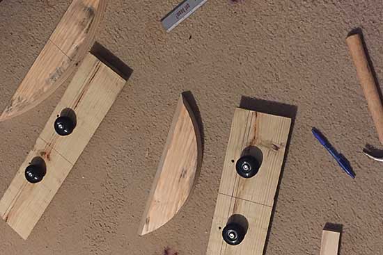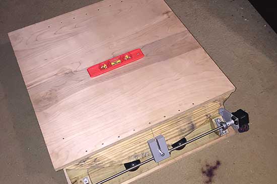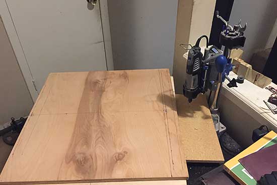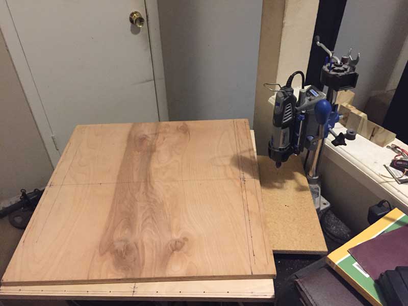 The top platform is set up for drilling holes using a Dremel tool. Pre-drilling the holes helped keep the round cuts from moving when attaching to square piece by drilling screws. I found that without pre-drilled holes, the round cuts would lose alignment on the square base.