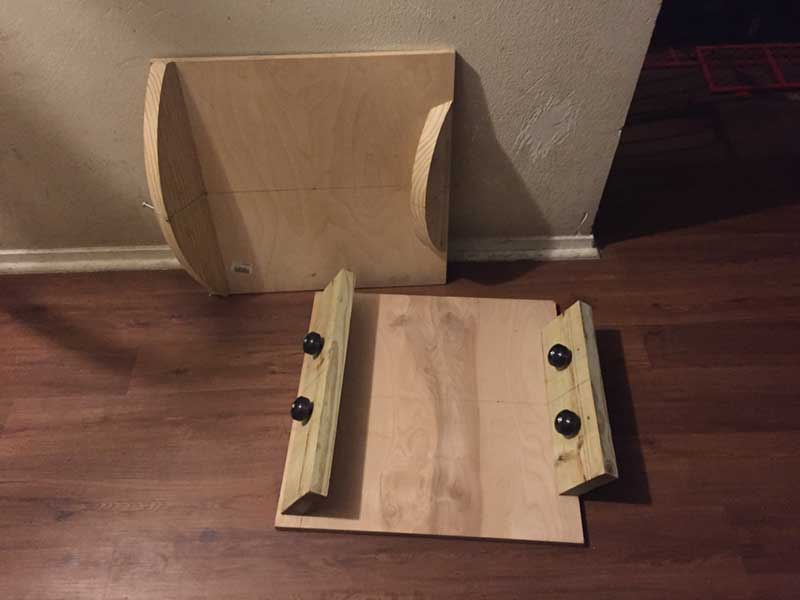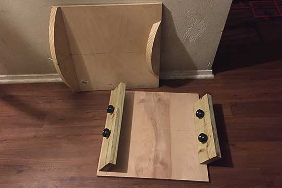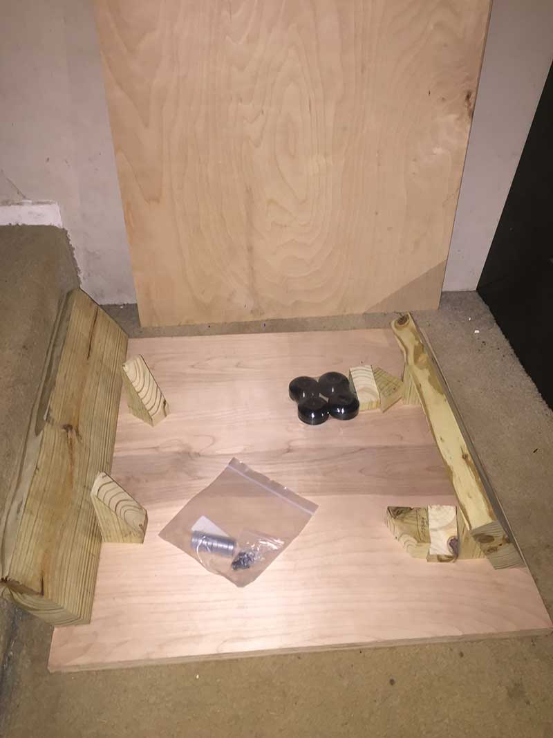 Rough cuts, skateboard wheels, and bearings used for initial assembling of base platform are assembled.