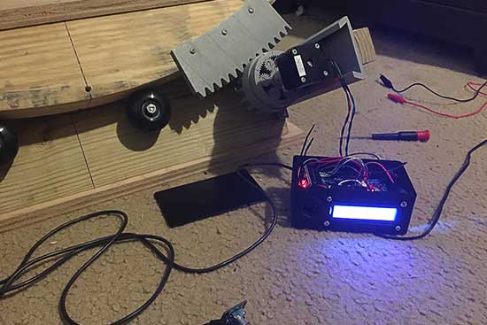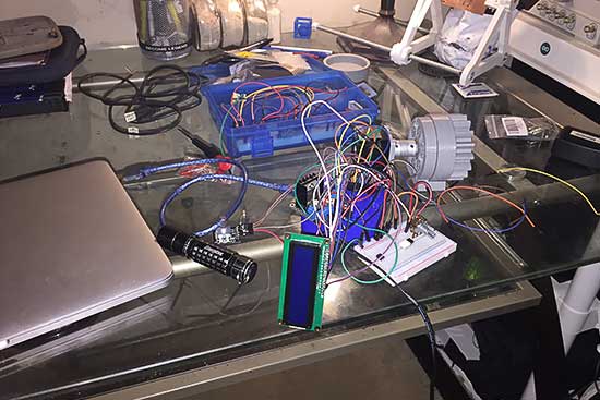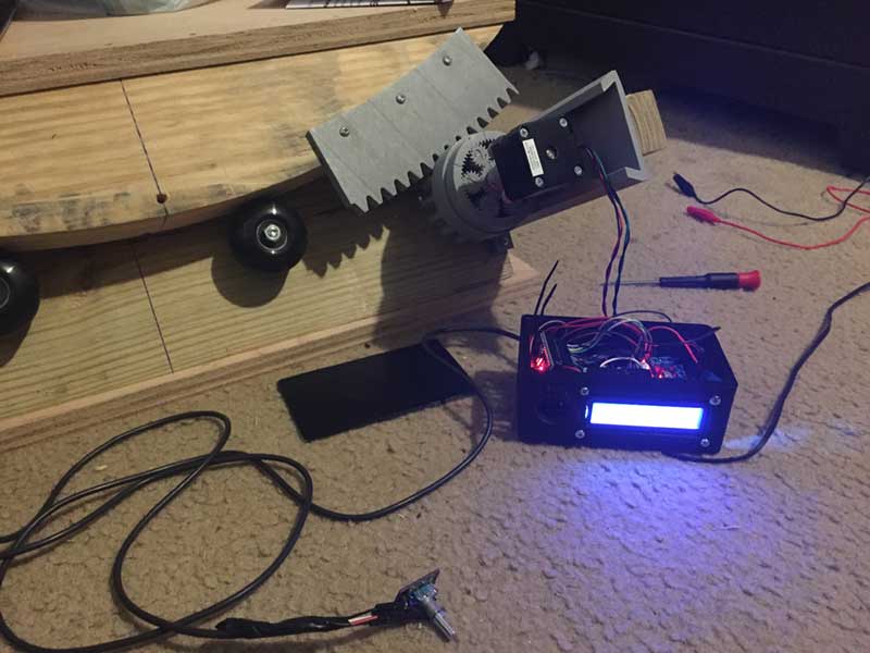 The control system wiring for the equatorial platform is complete. Notice the grey colored gear attached to the motor. This is the designed and 3D printed part used for direct system drive. The motor is coupled to the input(60 turns) planetary gear and the output(1 turn) has the spur gear attached.