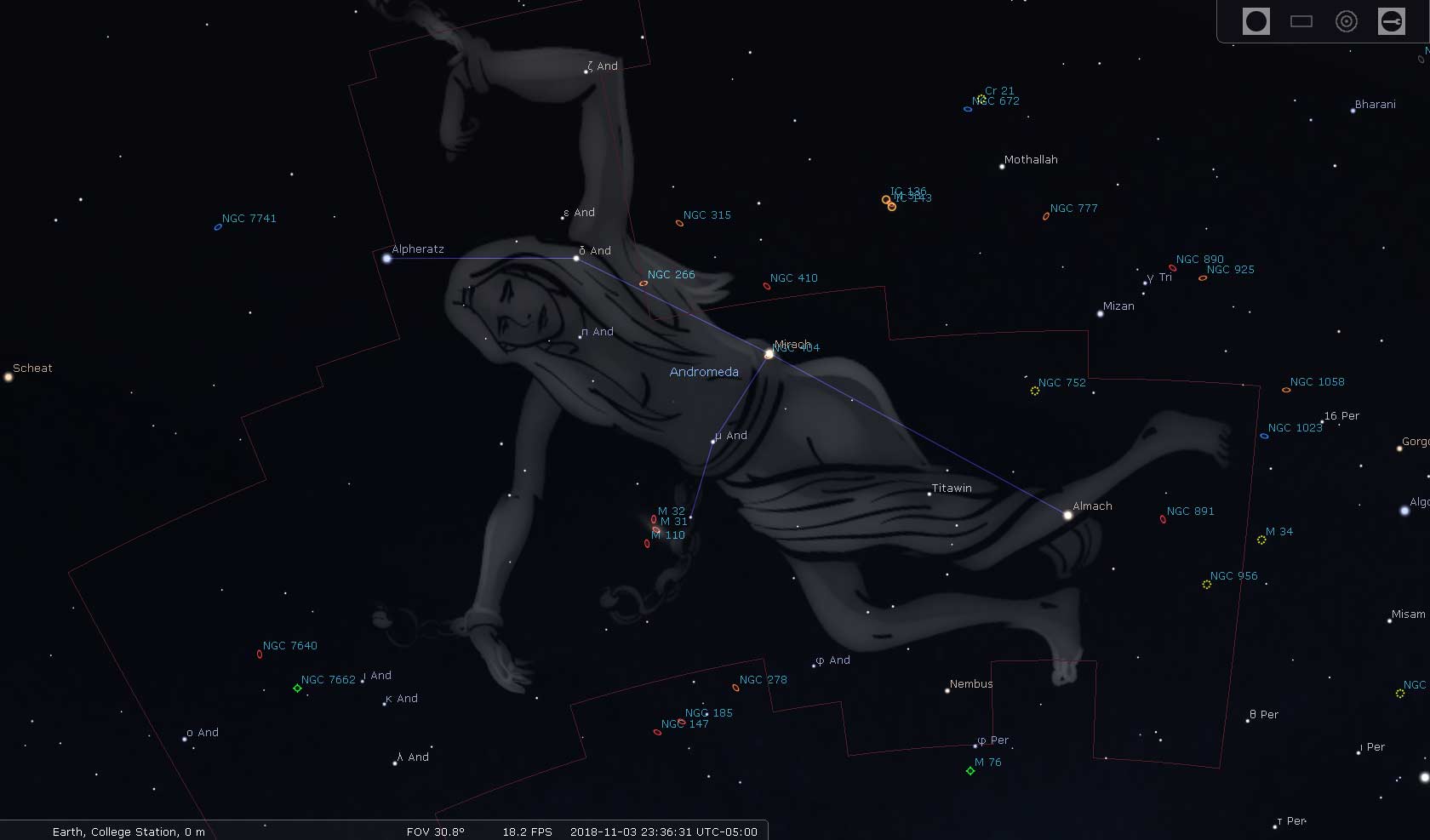 | π And | Double Star | 4.3, 7.1 | 598 | 00h 36.9m | +33° 43' |
