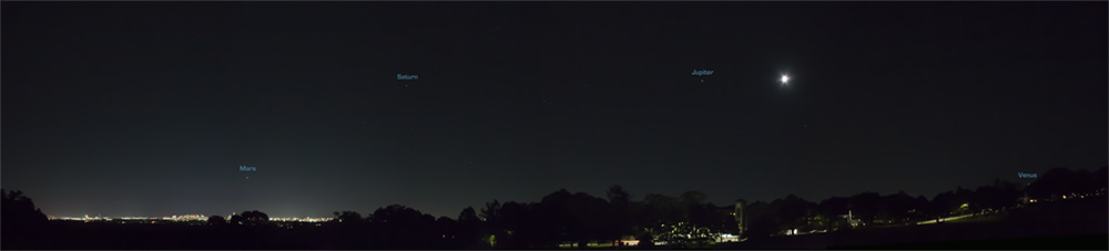 The photo below shows Mars, Saturn, Jupiter and Venus as taken by Ben Bray, my son, from Robbins Park in Arlington, Massachusetts, at 10:18 PM, EDT, on the night of July 18, 2018. He assembled this from 14 blended photos taken with his Canon 5D. He was in College Station earlier in July and we talked about this shot, and I am happy to see the results. City lights from Boston are in the background. Not imaged here are the planets Neptune, Uranus, and Pluto which are in the same field, but too dim to show.