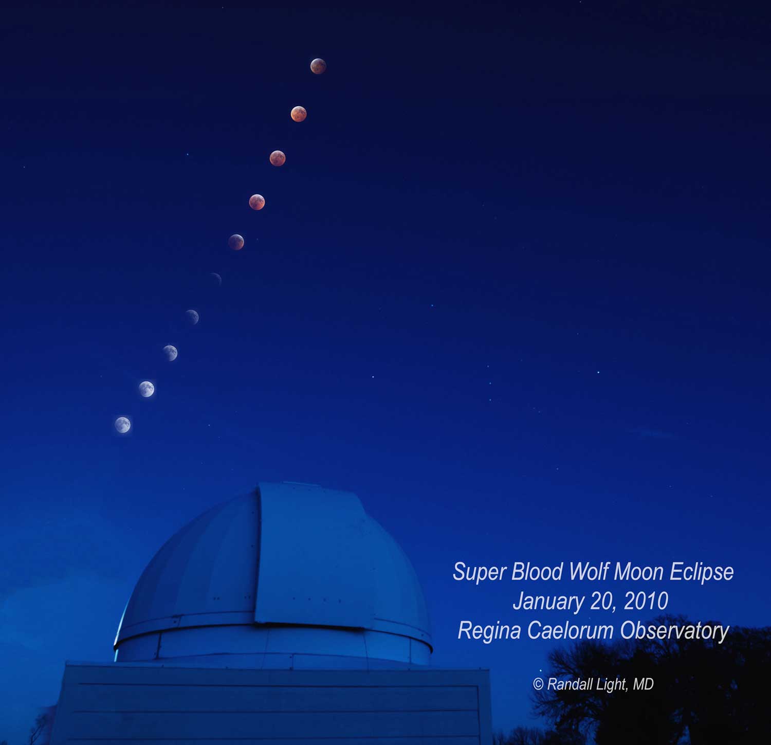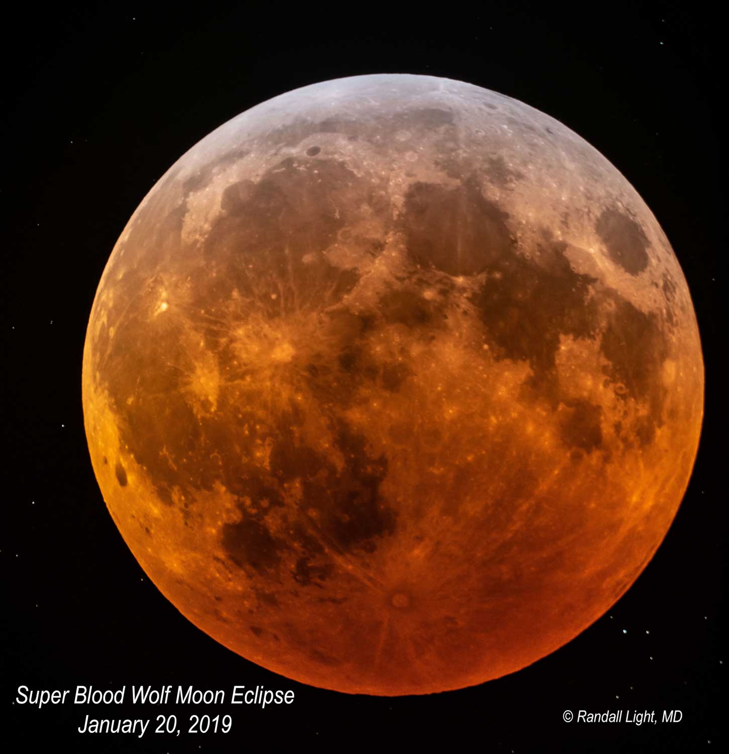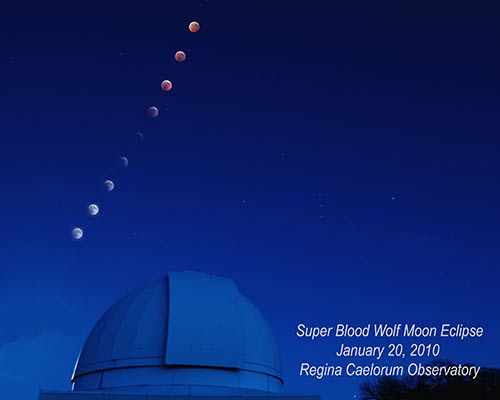 This year the conditions and options were better. On January 20, 2019 the night was clear and cold. Club members gathered at Regina Caelorum Observatory to observe and photograph an eclipse of a Super Blood Wolf Moon. Totality was at about 11:12 pm. The totally eclipsed moon was at an elevation of about 68 degrees and provided an excellent view of the eclipse.