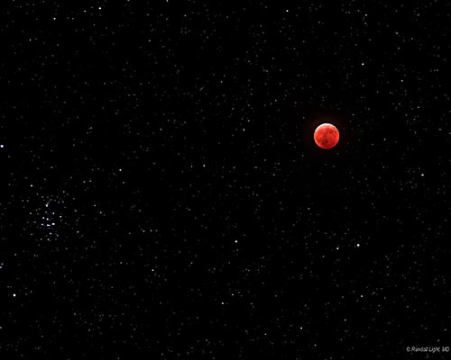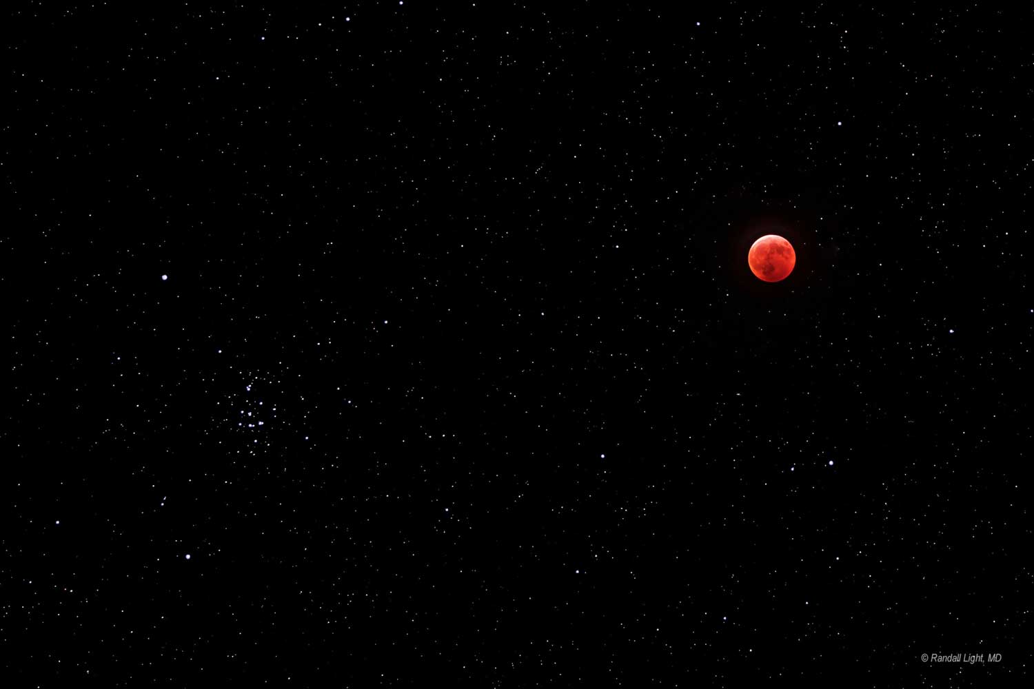 Figure 3 shows the totally eclipsed moon on the right and M44 on the left. The image was made with a 70-200 mm lens at 70 mm, an eight second exposure, ISO 1600, and f/2.8. The moon and M44 are separated by about 6.6 degrees. The field of view is about 10 degrees.