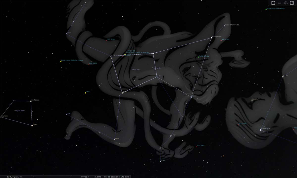 The constellation of Hercules lies north of the plane of the Milky Way and is home to a variety of celestial objects, including globular clusters, planetary nebulae and galaxies. There are actually two different asterisms located within Hercules. The most famous is the Keystone, consisting of the stars zeta (ζ), epsilon (ε), pi (π) and eta (η). The other asterism is the Butterfly, one wing of which is the Keystone and the other wing consisting of beta (β) and delta (δ).