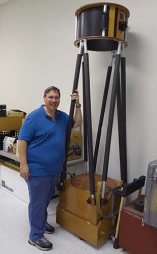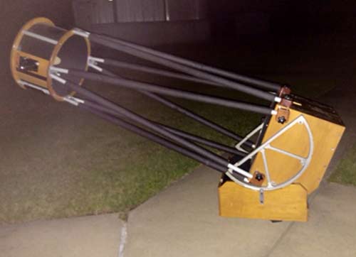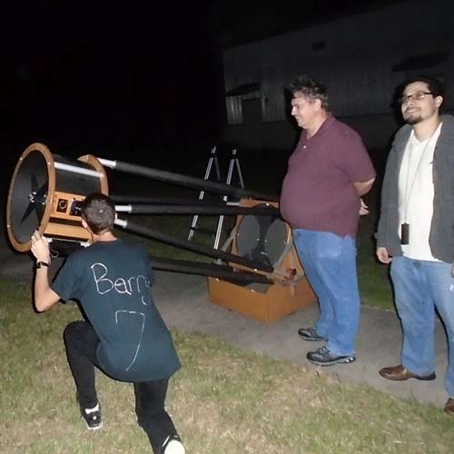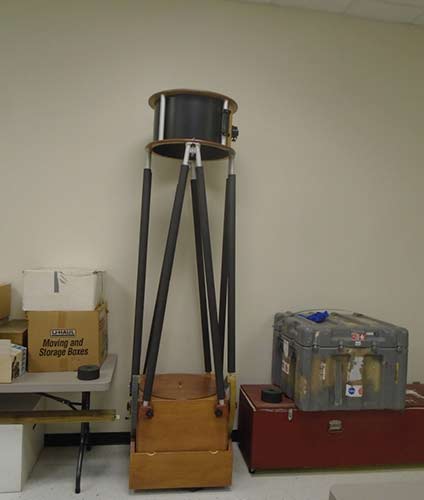 The Texas A&M Observatory has recently acquired a 20 inch Obsession telescope. Don Carona has graciously made it available for club use and outreach. This is a large Dobsonian telescope, and usually takes two people to set up and use. It is tall enough that a ladder is required to see through the eyepiece for anything half way up the sky. In spite of these minor obstacles, the view through the eyepiece is glorious.